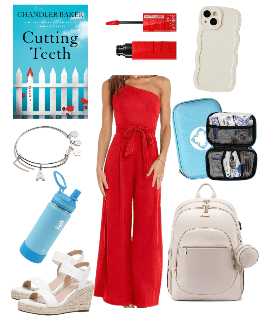 book / jumpsuit / bag / charm bracelet / first aid kit / shoes / case / lipstick / thermos